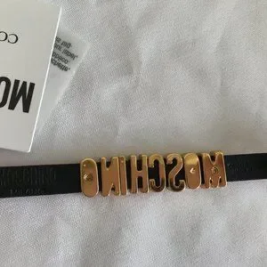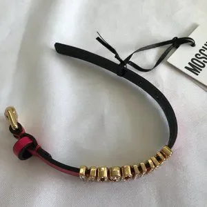 Statement bracelet with gold-tone crystal MOSCHINO letters. Pink and black leather band. Gold hardware accents. Adjustable buckle closure.