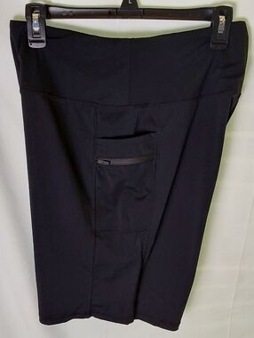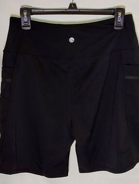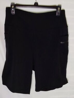 Premium black bike shorts designed for active days. High-rise waistband for a secure, flattering fit. Stretch performance fabric allows full range of motion. Integrated side pockets keep essentials close during runs or workouts. Sleek black design pairs easily with any top. 80% Polyamide 20% Elastane. Waist 30" stretches to 34". EUC.