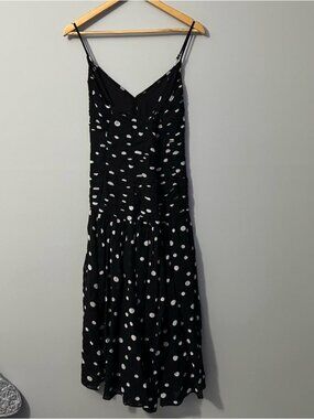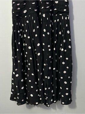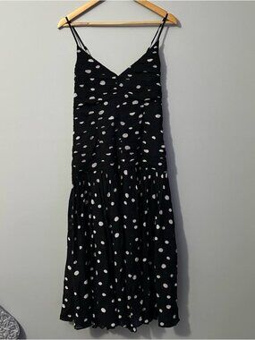 LOFT Polka Dot Midi Dress Black White Ruched Tiered Size 12 Coquette