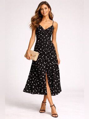 This effortlessly feminine LOFT midi dress brings a timeless charm with its classic black and white polka dot print. Designed with a flattering ruched bodice and flowy tiered skirt, it creates a soft, romantic silhouette that moves beautifully with every step. The delicate adjustable straps and lightweight fabric make it perfect for warm-weather days, vacations, or dressed-up evenings.