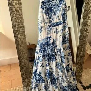 Drop-Waist Blue & White Floral Midi Dress in XS