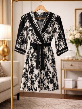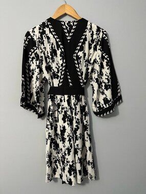 This CAbi X Factor wrap dress is a standout, feminine piece with a flattering silhouette and elevated design. Featuring a bold black and white floral print with kimono-style sleeves and a defined waist tie, it creates a polished yet effortless look that works for both daytime and evening wear. The wrap-style fit enhances the waist while the soft, flowy fabric adds comfort and movement. This is a catalog item, not available in stores. It is brand new without tags (NWOT), never worn, and in pristine condition. ⸻ Details: • Brand: CAbi • Style: X Factor Wrap Dress • Color: Black & White Floral • Sizes Available: Small, Medium • Condition: New Without Tags (NWOT) • Fit: Flattering wrap silhouette with adjustable tie waist • Sleeves: 3/4 length kimono sleeves • Features: V-neckline, A-line skirt, soft drape fabric • Source: Exclusive catalog item (not retail store) ⸻ Dress it up with heels for a chic, polished look or wear it casually with flats or boots for effortless everyday style. ⸻ Keywords/Tags: Cabi Style, Wrap Dress, Kimono Sleeve Dress, Black White Dress, Floral Dress, Elegant Chic, Modern Feminine, Office Chic, Brunch Outfit, Minimalist Style, Capsule Wardrobe, Timeless Fashion, Boutique Style, Quiet Luxury, Effortless Chic CAbi wrap robe in a bold black and white print. V-neck wrap front with a self-tie waist. Three-quarter sleeves with contrasting trim. Smooth, lightweight fabric for lounge or layering.