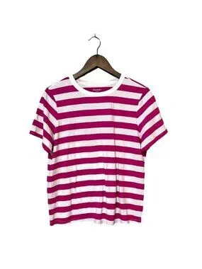 This striped cotton t-shirt features a classic crewneck design with bold pink and white stripes, offering breathable comfort and casual style.