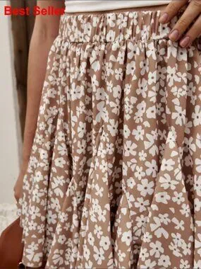 A high-waisted, flowing A-line skirt designed for casual comfort and bohemian flair. Features a vibrant floral print and ruffle details, perfect for beach outings, vacations, and everyday wear.