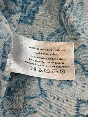 Nicoblu blue and white printed dress featuring intricate beaded and embellished detailing along the neckline. Crafted from lightweight 100% viscose with a soft, breathable feel.