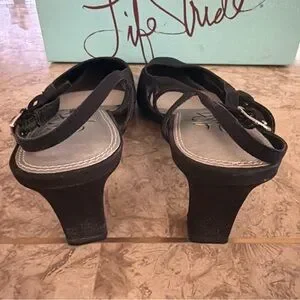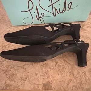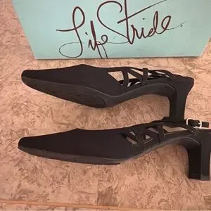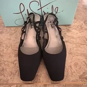 Elegant black slingback pumps by . Smooth black upper with a chic crisscross strap detail. Comfortable low heel and secure buckle for all-day wear. Versatile black style that pairs well with work or evening looks.