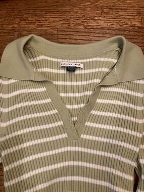 American Eagle Outfitters Light Sage and White Striped V-Neck Sweater