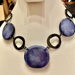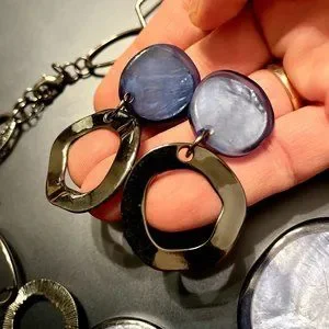 This is an incredibly stylish modern jewelry set (necklace & matching clip on earrings). The necklace is 20" with 3" extension with dark slightly hammered metal hoops and frosty blue lucite round pieces. The clip on earrings consist of similar but slightly smaller hoops which are 2" in length. Both pieces are lightweight and in excellent preloved condition.