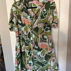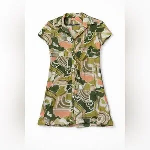 Anthropologie brand mini dress with a bold abstract print. Short sleeves and a relaxed button-front silhouette. Lightweight, breezy fabric with playful pattern. Easy slip-on style for casual wear.