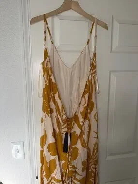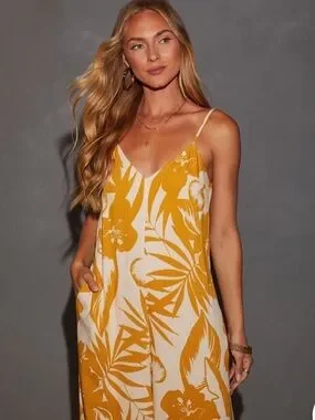 NWT- Effortless vacation style in a yellow floral wide-leg jumpsuit. Lightweight, breezy fabric with a V-neck, adjustable spaghetti straps and pockets. Open back with tie detail for a flattering fit. Easy to dress up or down for daytime and evenings.