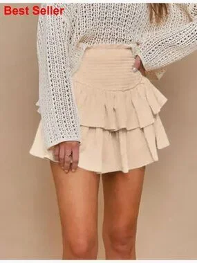 A cute and flowy A-line mini skirt featuring a two-layered tiered ruffle design. The soft, lightweight fabric and stretchy elastic waistband make it a comfortable pull-on piece, perfect for casual wear, beach outfits, and transitioning through spring, summer, and fall.