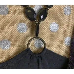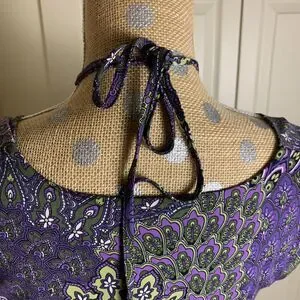 The Vintage Y2K Purple Floral Top Tunic is a charming piece perfect for those who embrace retro aesthetics with a hint of goth flair. Featuring a paisley pattern, cowl neck, sleeveless design, and embellishments like jeweled beaded halter ties, this top exudes a fairy-like character ideal for fans of the Y2K, Mcbling, and Gothic styles. The medium size and camisole style make it versatile for layering or pairing with leggings for a unique and whimsical look.