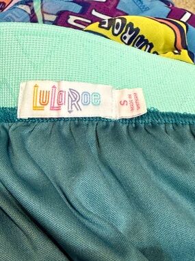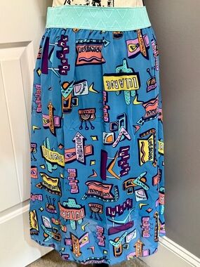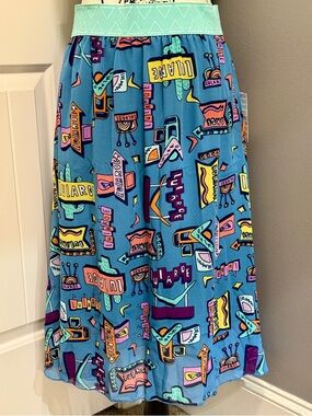 This colorful item is the LuLaRoe Lola midi skirt, featuring a vibrant, retro-themed print.