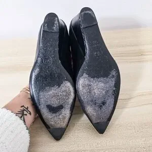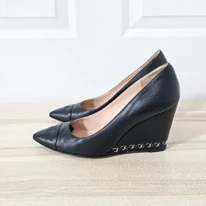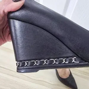 tags:Chanel black wedge heels,Chanel wedge pumps,Chanel leather wedge shoes,Chanel CC cap toe wedges,Chanel chain detail wedges,Chanel logo wedge heels,Authentic Chanel wedges,Chanel black leather pumps,Chanel pointed toe wedges,Luxury black pumps,Elegant wedge pumps,Leather chain trim heels,Women’s pointed toe wedges,Classic black wedge heels,Timeless designer footwear,Office to evening shoes,formal,business, classic,cocktail