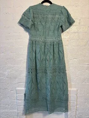 Lovely heart-shaped eyelet lace dress. Fully lined. Never worn. Cute mini-puff sleeve. Modest but super chic. Measurements in photos. Slight imperfection at hem.
