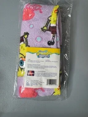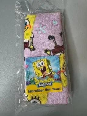 Licensed SpongeBob SquarePants microfiber hair towel. Predominantly pink with yellow SpongeBob character motifs. Soft and absorbent fabric. Playful cartoon design for fans.