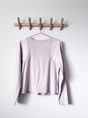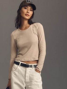 Lightweight long-sleeve tee with a cropped hem. Crew neckline and subtle seam detailing at the shoulders. Slim, casual fit in a neutral beige tone. Easy to layer or wear alone.