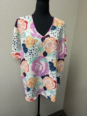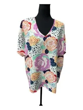 Features: Vibrant oversized floral print, Flattering V-neckline, Lightweight, breathable fabric, Relaxed, flowy fit, Boutique-style design, Made in USA