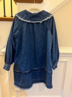 Dark blue denim dress with a frayed Peter Pan collar. Button-front placket with visible buttons. Soft gathered yoke at the neckline. Casual, feminine silhouette.