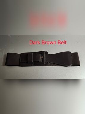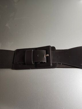 Stylish New York & Co dark brown elastic stretch waist belt with a wide patent leather front panel. Designed for comfortable stretch and a secure buckle closure for a statement accessory to casual or dressy outfits. Dark brown color complements neutral wardrobes.