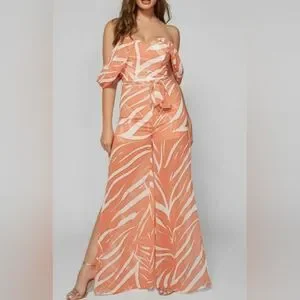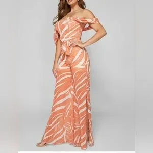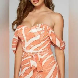 gorgeous off-the-shoulder jumpsuit made in a stunning jungle print. Designed with a sweetheart neckline, waist tie detail and a wide-leg fit with slits down the leg fronts. Invisible back zip closure.