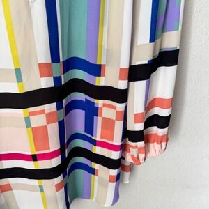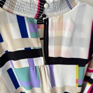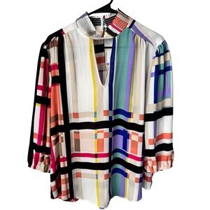 New York & Company 7th Avenue Geometric Plaid Smocked Mock Neck Blouse XL