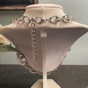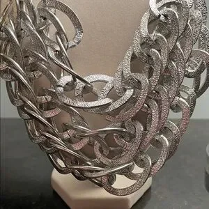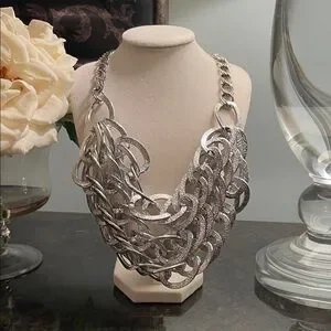 Bold silver multi-strand chain necklace with textured and smooth links. Designed to make a statement with any outfit. Lightweight feel and secure clasp for comfortable wear. Perfect for dressing up or elevating everyday looks.