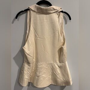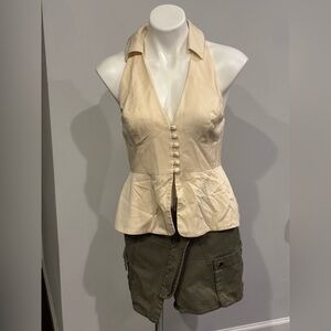 Sleeveless halter top with deep V neckline. Button-front detail down center. Fitted waist with peplum hem. Structured, elegant silhouette. Perfect for dressy occasions.