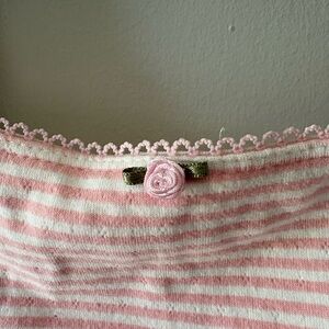Soft pink and white striped crop tank with a scoop neckline. Lightweight cotton blend for everyday comfort. Delicate lace trim and a small front bow add feminine detail. Perfect for layering or casual summer wear.