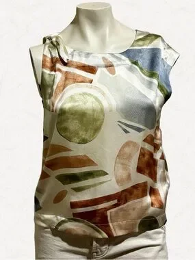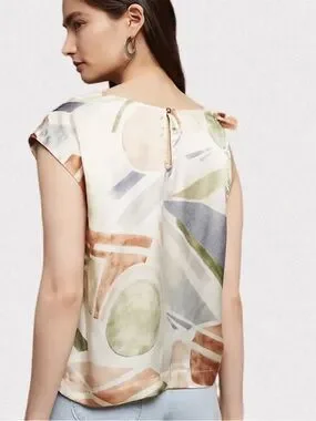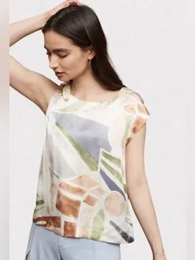 This Maeve blouse from Anthropologie features a stunning abstract geometric print in a warm “beige multi” palette with earthy tones of green, terracotta, and blue.
