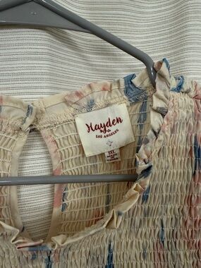 Hayden sleeveless ruffle top. Watercolor wash in blush pink and dusty blue on a cream base. Smocked bodice with soft ruffle trim. Lightweight and feminine. No stretch but gorgeous colors!