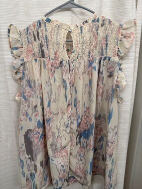 Hayden LA Cream Top w Blush Pink & Dusty Blue Watercolor Ruffle sleeve 1XL NWT