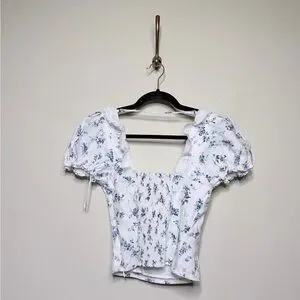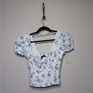 Darling puff sleeves sweeten the silhouette of this cropped top covered in enchanting blooms and romanced by fluttering lace.