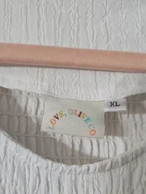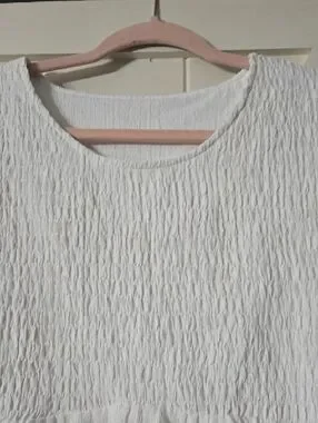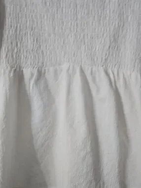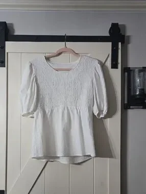 White smocked bodice with soft puff sleeves and a gentle peplum hem. Lightweight textured fabric offers breathable comfort. Elegant white top that pairs easily with jeans or skirts for polished everyday looks.