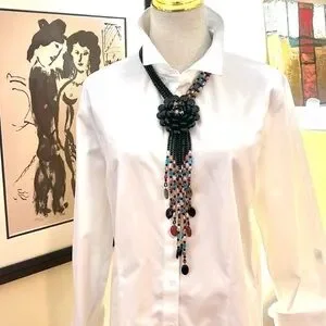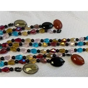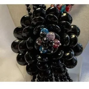 Add a touch of elegance and sophistication to any outfit with this stunning designer signed Joan Rivers black starlet flower beaded necklace. The necklace features a beautiful flower pendant in black and multicolor with a lobster closure. The necklace is approximately 19"-22" in length and has a ball/bead chain type. This necklace is perfect for any occasion, including engagement, wedding, anniversary, graduation, birthdays, Father's Day, Mother's Day, Christening, and Confirmation/Communion. The necklace is layered and has a fringe style, making it a statement piece. The necklace is not antique or vintage but has a bohemian and fashion & costume theme. The necklace is made of silver tone metal and is perfect for those who love beauty, art, and flowers & plants. Elegant multicolor beaded necklace with a striking black centerpiece. Perfect for adding a pop of color to any outfit.#vintage #jewelry #joanrivers #collectible #statement #statementnecklace #couture #instafamous #fashion #collectible