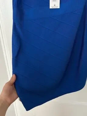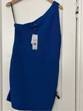 Bandage dress. Retails for $790! Sleek one-shoulder silhouette. Structured bandage knit for a fitted look. Bold cobalt blue hue throughout. Modern, minimalist styling for events or evenings.