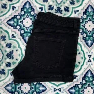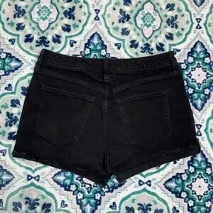 Classic black denim shorts with a high-rise fit. Features a raw hem for a modern edge. Comfortable for everyday wear. Versatile black color that pairs easily with tops.
