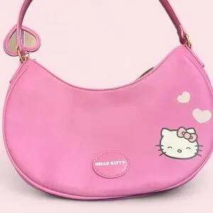 Playful Hello Kitty shoulder bag in bright pink. Gold-tone bow accent at center. Heart and pearl stud embellishments. Crescent silhouette with single shoulder strap. Charming fan-favorite design.