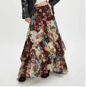 NWT Free People Palermo Villa Chiffon Maxi Skirt-Chocolate Combo