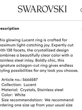 This glowing Lucent ring is crafted for maximum light-catching joy. Expertly cut with 138 facets, the crystallized design combines a beautifully clear color with a stainless steel inlay. Boldly chic, this signature octagon-cut ring gives endless styling possibilities for any look you choose.