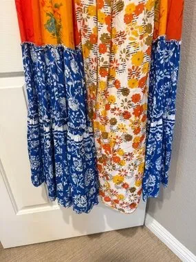 Free People boho patchwork maxi dress with smocked waistband and flowy silhouette. Features a mix of floral prints and bold colorblocking — super unique statement piece.