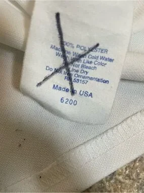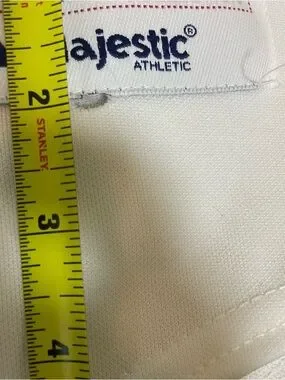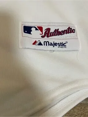 Majestic branded baseball jersey tag visible. White fabric with red and navy logo stitching. Classic authentic collection label. Simple team-ready styling.