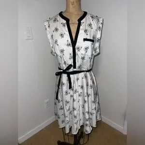Sleeveless midi dress with playful bicycle print. Black contrast trim along V-neck, pocket, and button placket. Includes self-tie black belt to define the waist. Casual and fun for daytime wear. Needs to be steamed.