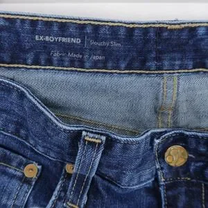 Premium blue denim jeans in a slouchy slim ex-boyfriend fit. Features classic five pocket styling with a zip fly and branded button closure. Made from a comfortable stretch cotton blend with a lived-in aged appearance.