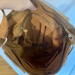 Adjustable shoulder strap with fold over flap. Zip top closure under flap.