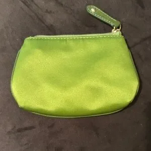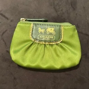 Compact Coach coin pouch in green satin. Gold logo plaque and trim on front. Zip top closure with leather pull. Sleek and lightweight.