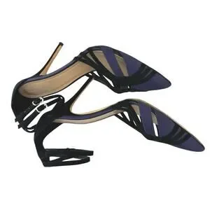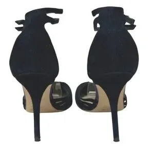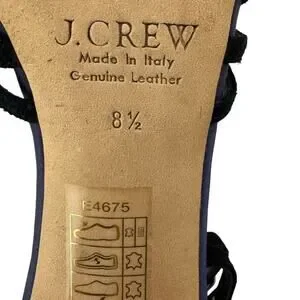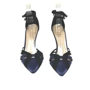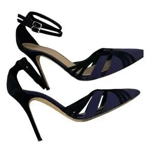 Elegant J. Crew stiletto heels. Pointed toe with strappy overlay. Ankle straps with buckle closure. Contrasting navy and black panels. Sleek high heel silhouette.