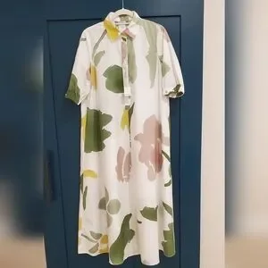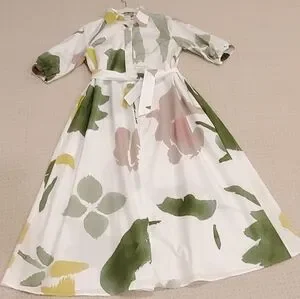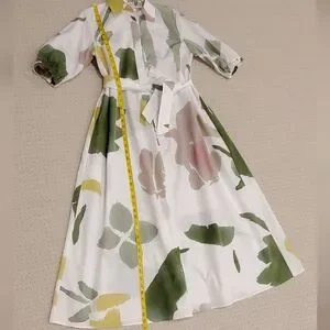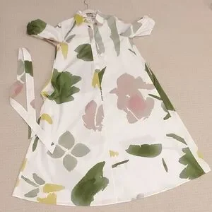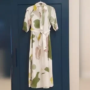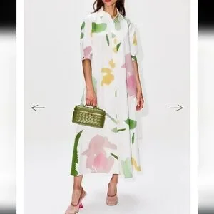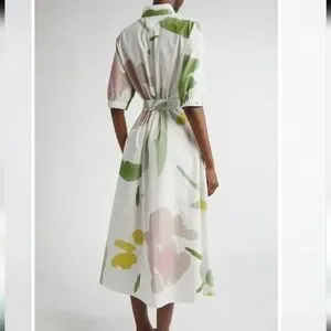 MaxMara Made In Italy, Botanical Canter Shirt Dress, Authentic, Authentication Verified by Poshmark, Full-Volume Flare Cotton Poplin Dress, Stunning Long Shirt Dress with Full Volume Flare Sillouette, Collar, Short Puffy Sleeve with Smock Elastic Banding and Interwoven Tie Lace Detail, Partial Front Hidden Button Neckline, 1 Top Collar Branded Exposed Button, Distinguished Full Flare Sillouette, Optional Belt for Versatile Styling/ Wear Loose/Flowy Without Belt or Belted for a Fitted Style, 2 Side Inset Pockets, 100% Pure Cotton Poplin, Crisp White with Beautiful, Water-color Like Floral Print in Hues of Green, Mauve Pink and Golden Yellow, Contemporary Floral Print, Absolutely Stunning! Even More Beautiful in Person! Purchased for Wedding, Unfortunately couldn't Attend, Nordstrom $1,480.00 Retail, New With Tags/Extra Buttons, NO WEAR! PERFECT Condition, Authentic, Women's US Size 4, Approximate Measurements: 14.5" Sleeve, 50" Shoulder to Hemline Length, 20.5" Armpit-Armpit, Originally sold at Nordstrom but returned due to missing button, Nordstrom "refurbished"/ Replaced Button, then Sold at Nordstrom Rack, where I purchased the dress. Contemporary, Classic, Classy, Timeless, Elegant, Wedding Guest, Special Occasion, Coastal, Modern, Sophisticated, Stylish, Boho, Couture, Luxurious, Designer, Italian, Fresh, Artsy, Polished, Lady Like, Garden, Vinery, Photoshoot, Flowy, Sexy, Italy, Engagement, Bachelorette, Party, Celebration, Lake Como, Fairy, Earthereal, Goddess,