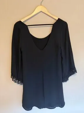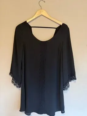 Sheer black tunic with lace trim down center and on sleeve cuffs. Scoop neckline and three-quarter sleeves. Flowy silhouette layers easily over swimwear. Simple, elegant beach-to-street piece.
