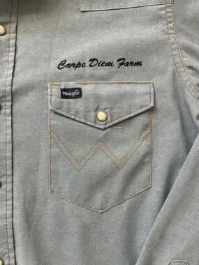 Classic western style with a unique touch—this Wrangler chambray shirt features “Carpe Diem Farm” embroidery and timeless snap-button details.